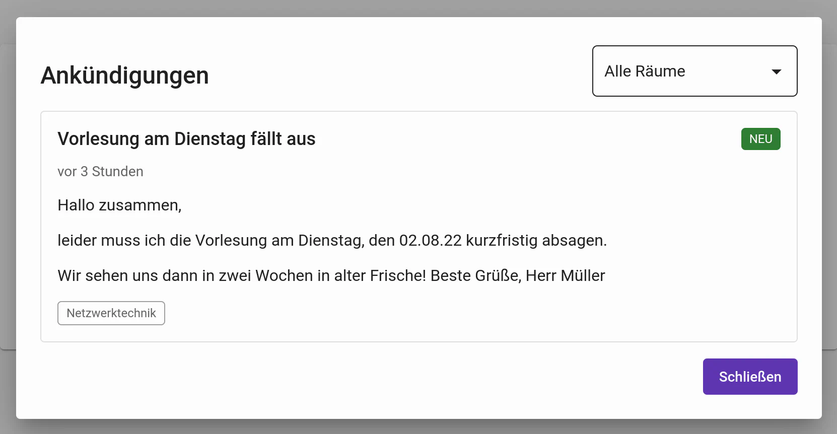 Mit Ankündigungen können die Teilnehmenden über Termine und Neuigkeiten informiert werden. Diese können von überall in der Anwendung über die Glocke in der Kopfleiste erreicht werden. Verwaltet werden die Ankündigungen in den Raumeinstellungen.