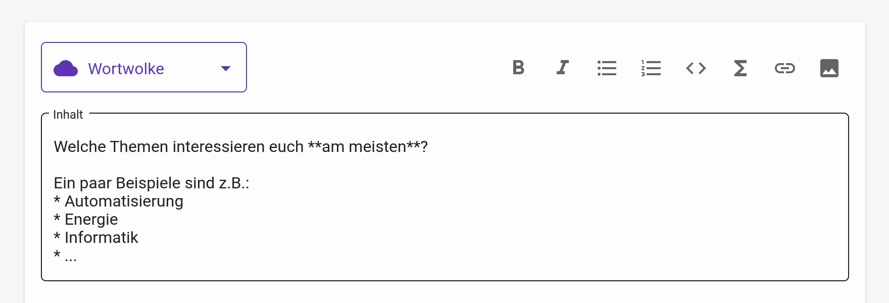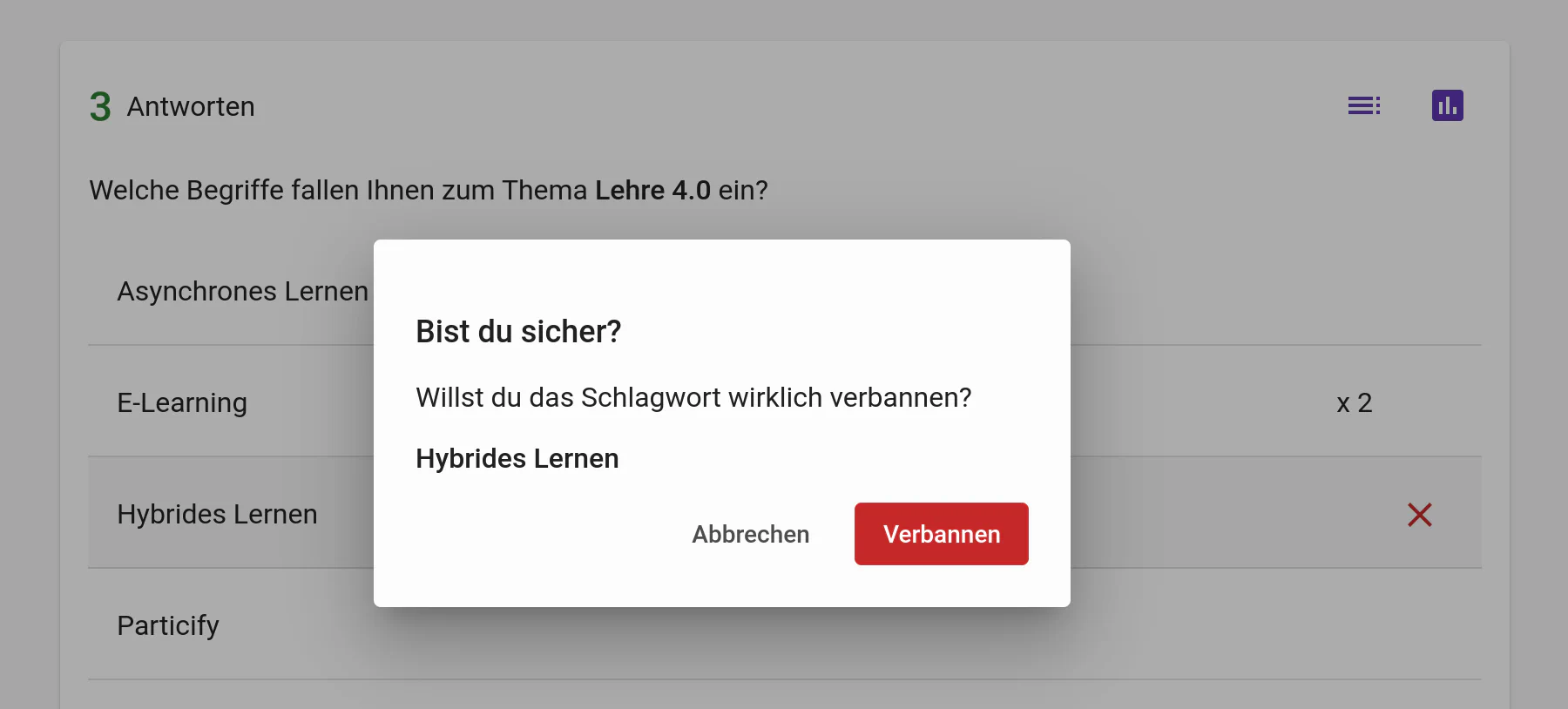 Die Antworten von Wordcloud-Inhalten und offenen Fragen können jetzt moderiert werden. Dazu kann bei Wordcloud-Inhalten in die neue Listenansicht gewechselt werden. Anschließend können Schlagwörter gebannt werden, sodass diese nicht in der Wordcloud angezeigt werden. Antworten auf offene Fragen können gelöscht werden.