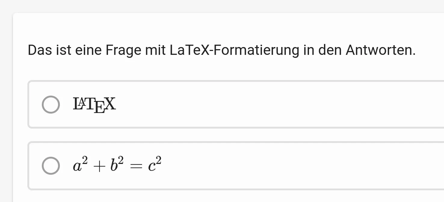 Antwortoptionen von Multiple-Choice-Fragen können ab sofort mit LaTeX formatiert werden.