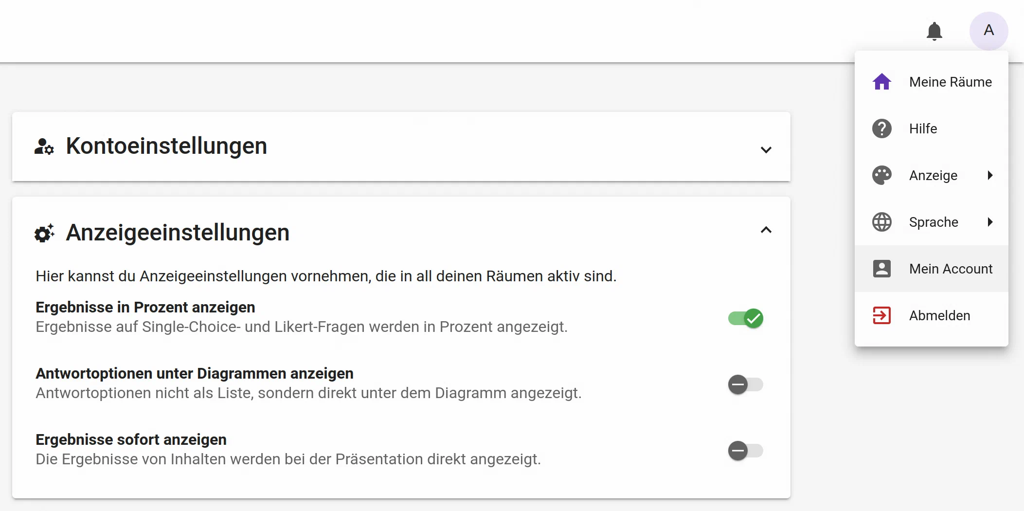 In den Accounteinstellungen können Anzeigeeinstellungen für die Visualisierung von Ergebnissen festgelegt werden, welche in allen Räumen aktiv sind. Die Einstellungen erreicht man über das Hauptmenü in der rechten oberen Ecke.