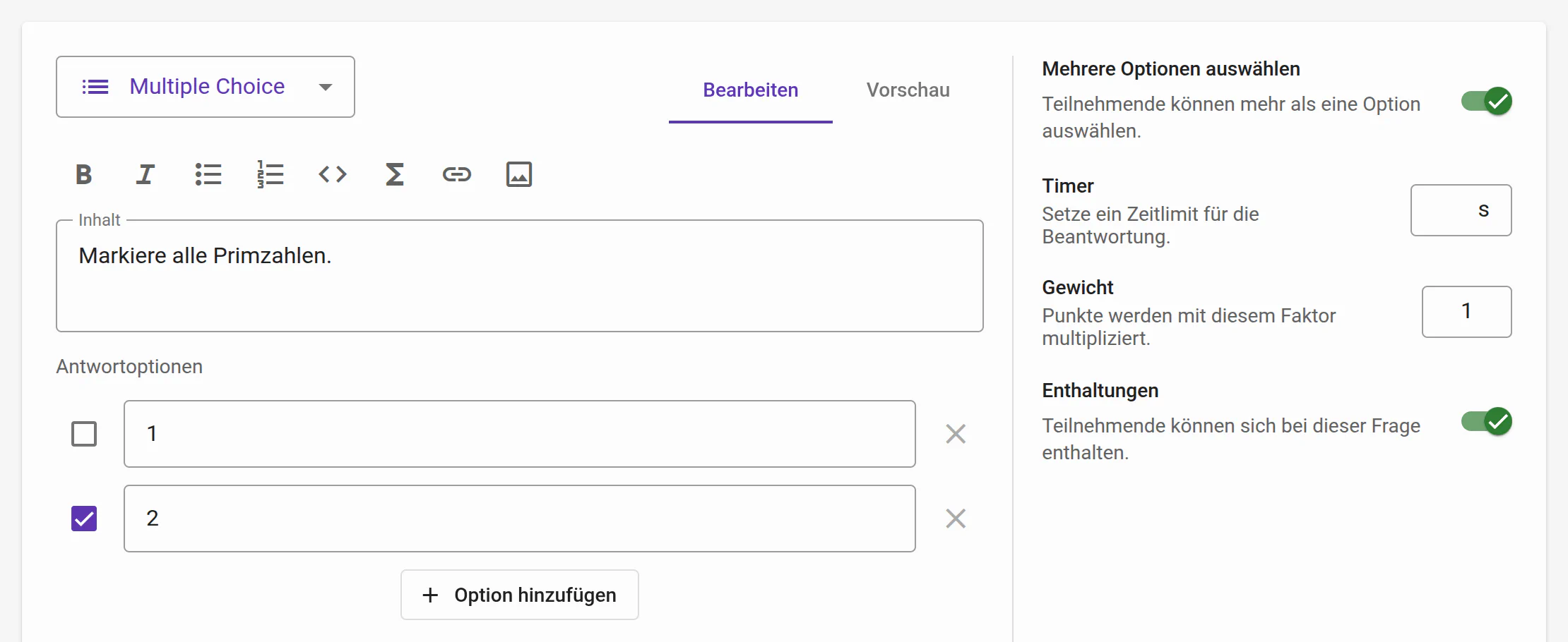 Zur besseren Übersicht werden auf größeren Bildschirmen jetzt die Einstellungen für Inhalte in einer separaten Spalte angezeigt. Das Hinzufügen/Bearbeiten/Entfernen von Antwortoptionen wurde optimiert.Kachelansicht für Wortwolken