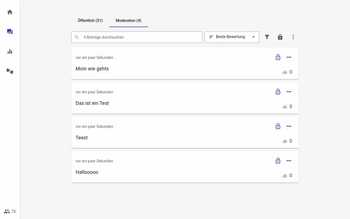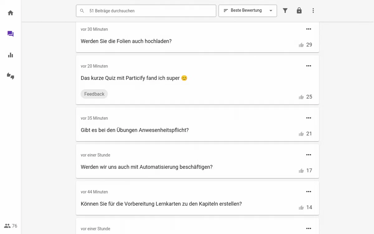Im Präsentationsmodus können Sie die Fragen beqeum nacheinander durchgehen. Mit der Sortierung nach Bewertung können Sie die wichtigsten Fragen voranstellen.