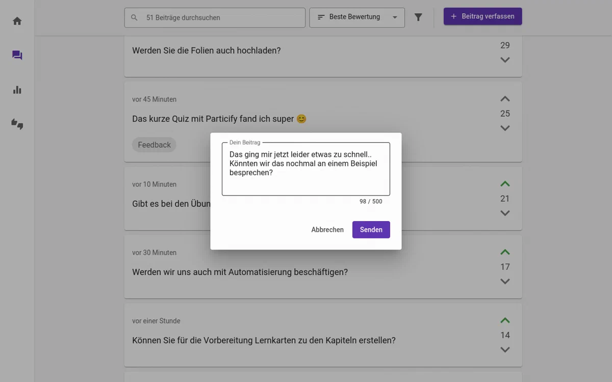Durch das Bewerten von den Fragen der Anderen können die wichtigsten Fragen priorisiert beantwortet werden.